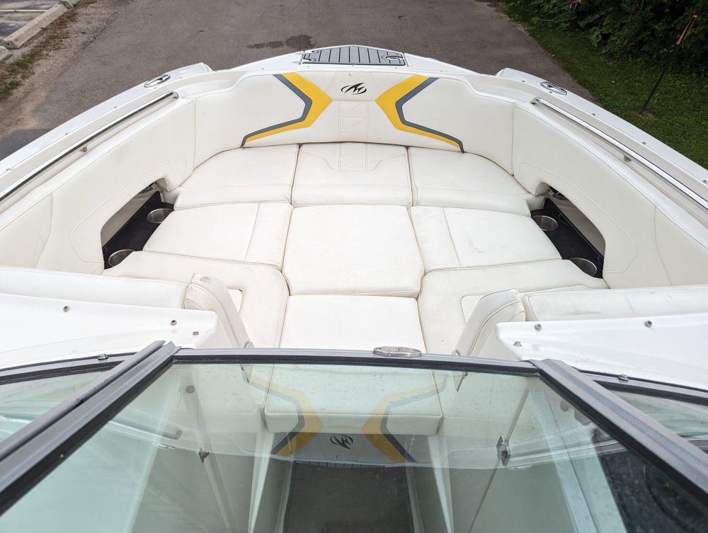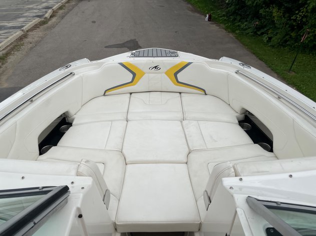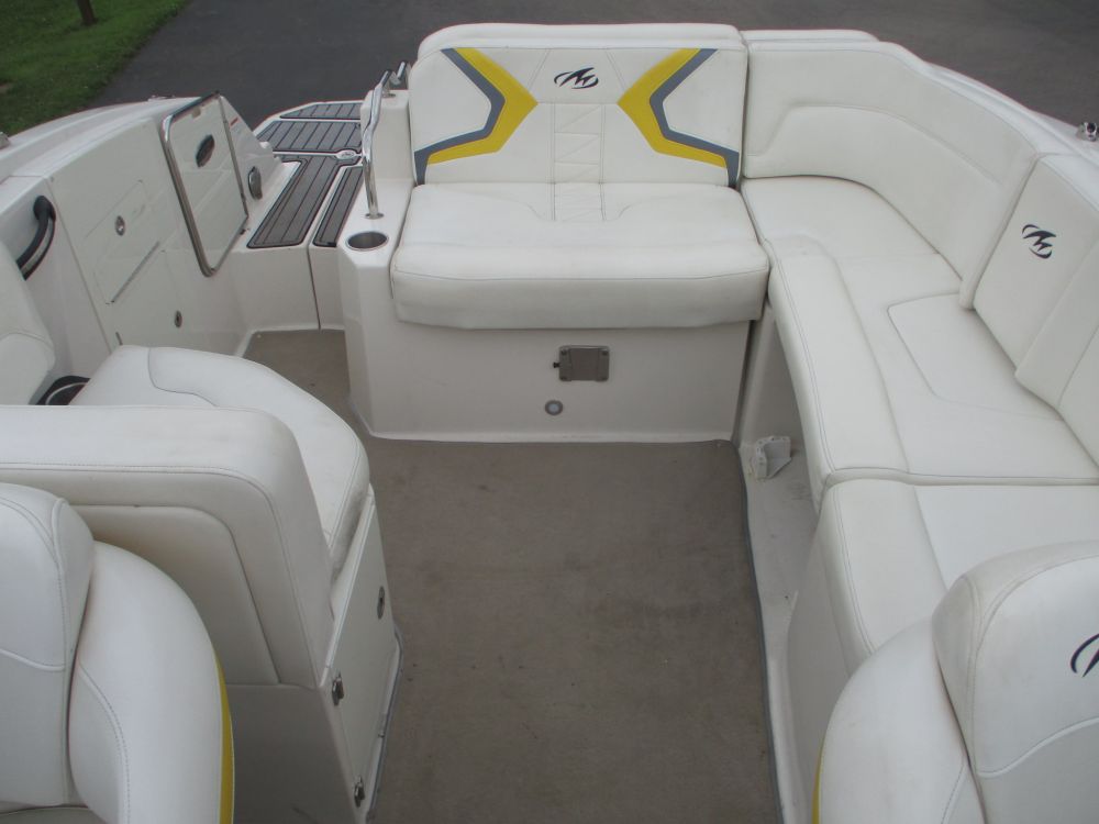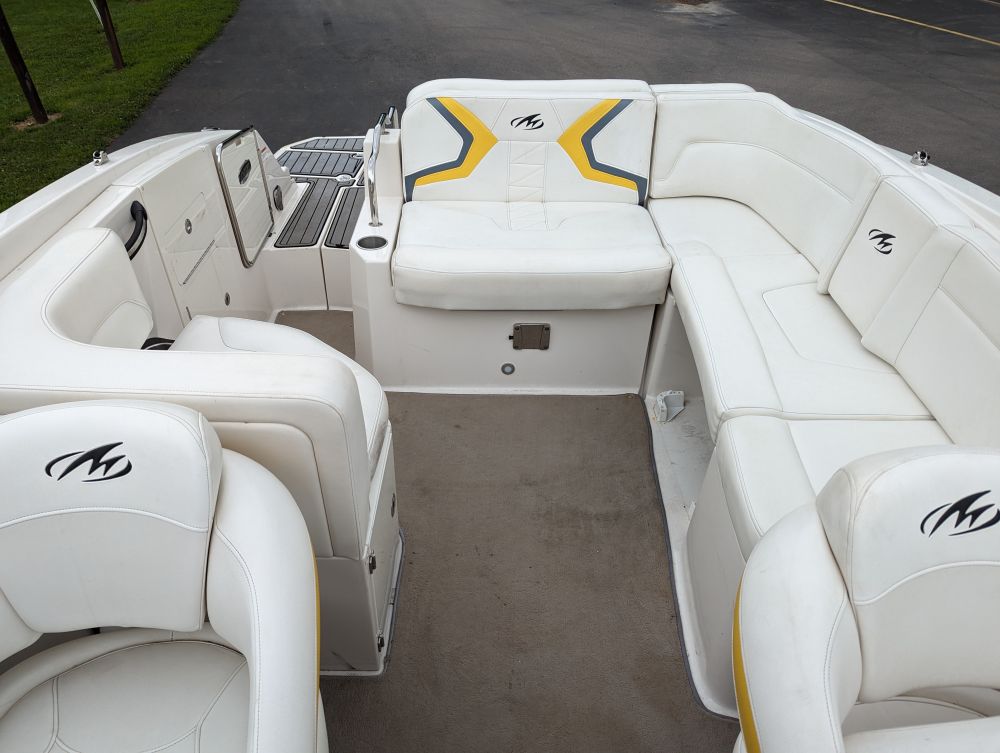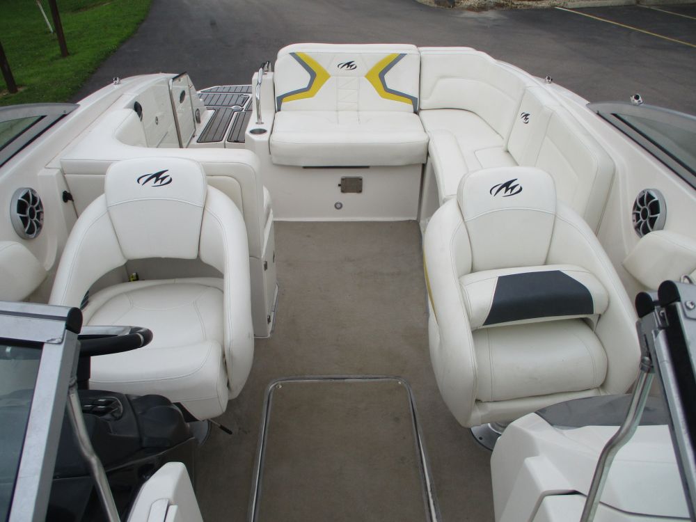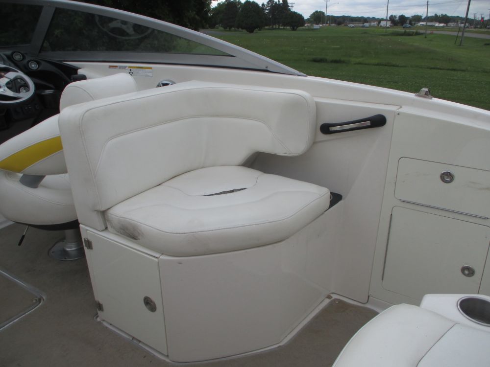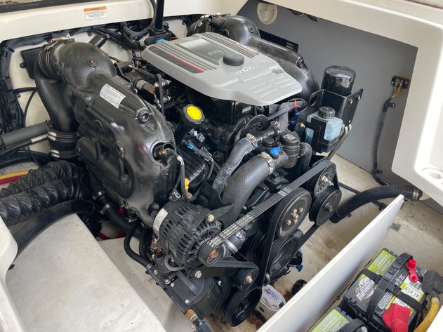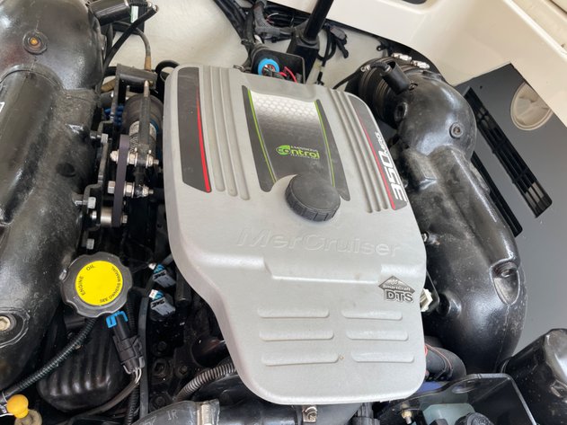 25'10", 5.7L MerCruiser 350MAG engine, convertible sun lounge, Bravo Three out drive, Electronic shift, stereo, toilet and sink, dual axle trailer (bill of sale only), 2-5/16" ball, starts and runs, has insurance claim history. Must call with questions or viewing, Item purchased with a damaged windshield and misc fiberglass damage that has been repaired. Boat has some upholstery flaws as pictured. 350. Extremely well laid out and roomy with power rear seat that extends to lounger