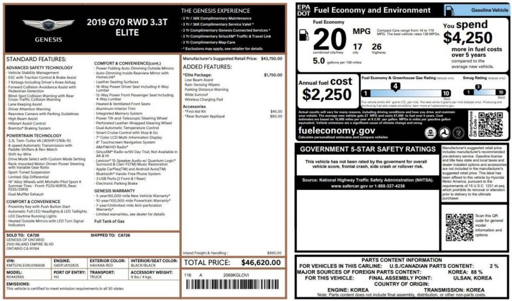 2019 Genesis G70 3.3T Elite